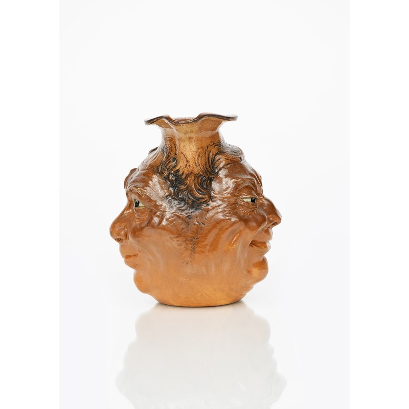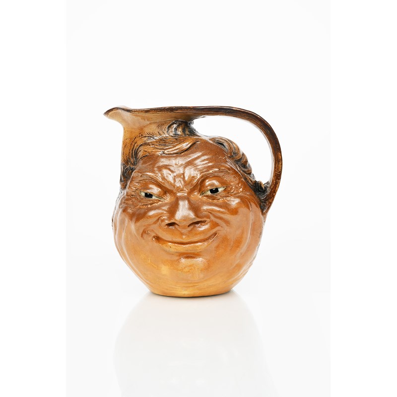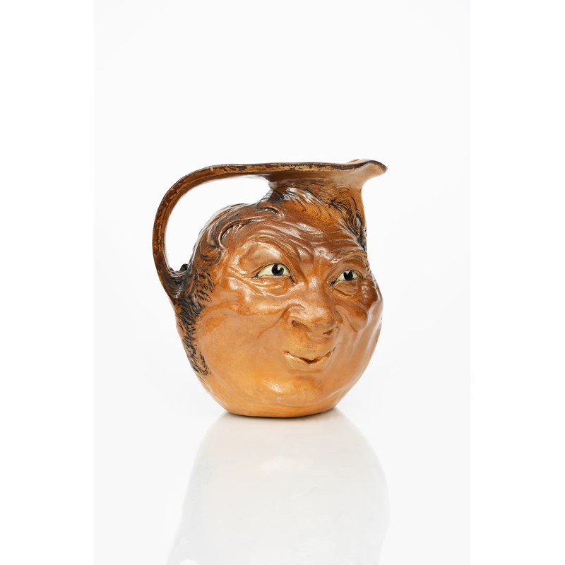 A large and impressive Martin Brothers stoneware face jug by Robert Wallace Martin, dated 1902, modelled on one side with a smiling face, the reverse modelled with pursed lips, glazed tan and brown, highlighted with black and white, incised 5 1902, R W Martin & Bros London & Southall, 21cm. high