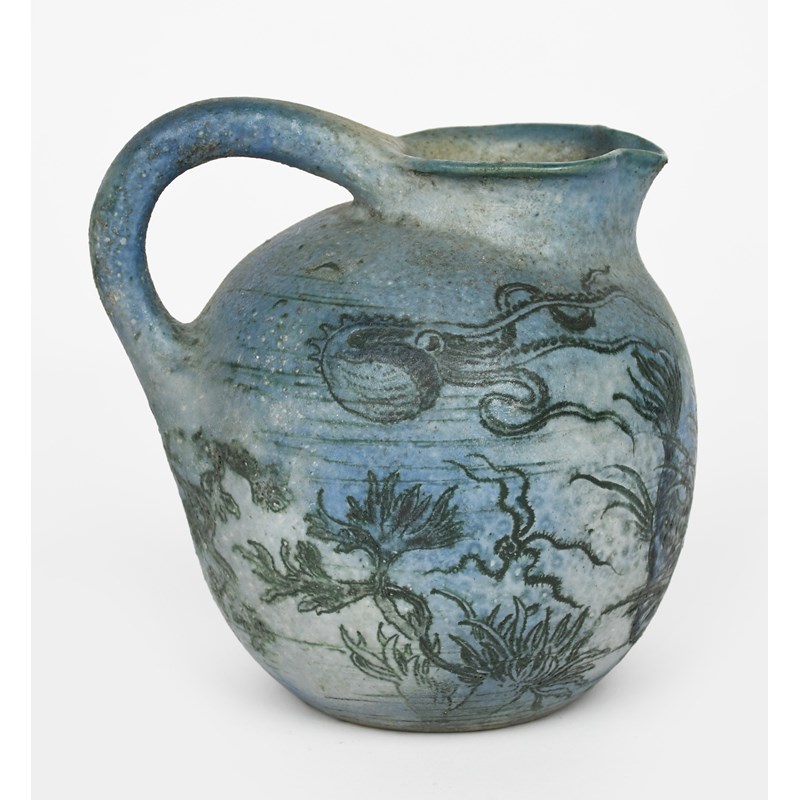 A Martin Brothers stoneware aquatic jug by Edwin and Walter Martin, dated 1895, ovoid with loop handle, incised with a large scaly fish swimming amongst jelly fish, a lobster and waterweed, in green on a blue ground, incised 12-1895 Martin Bros London & Southall, 16cm. high