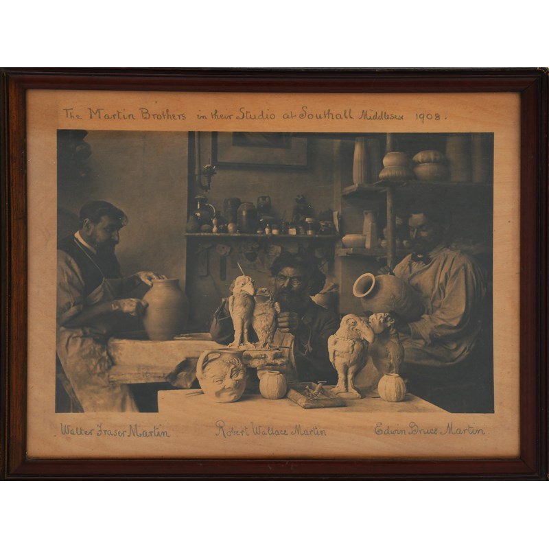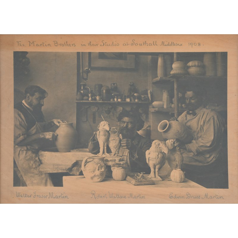 The Martin Brothers in their Studio at Southall Middlesex 1908, a photograph of Walter, Robert and Edwin working in the studio, framed, annotated in pencil, 29 x 20.5cm (image)