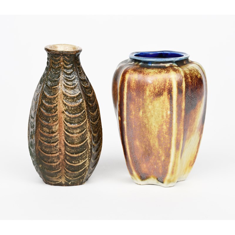 A Martin Brothers stoneware gourd vase by Edwin and Walter Martin, swollen octagonal form with modelled ribs and horizontal veins, glazed ochre over tan, and another Martin Brothers stoneware gourd vase incised GX No.3 BM, 13.5cm. high, (2)