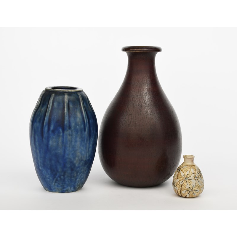 A Martin Brothers stoneware gourd vase by Edwin and Walter Martin, pear shaped, modelled in low relief with textured ground and white flowerheads, another Martin Brothers gourd vase glazed blue and a tall brown pear shaped gourd vase, incised Martin London, crack to base of main vase, 7.5cm. high (3)
