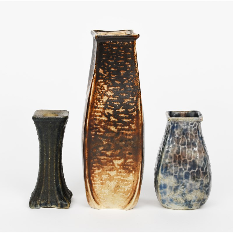 A Martin Brothers stoneware gourd vase by Edwin and Walter Martin, dated 1902, swollen square section, with flared rim, covered in a mottled chestnut brown glaze, and a ribbed candlestick and a late Martin ware gourd vase, incised 2-1902 Martin Bros, London & Southall, no.7, professional restoration to top rim, 24cm. high, (3)