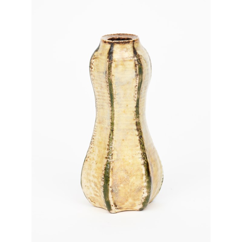 A Martin Brothers stoneware gourd vase by Edwin and Walter Martin, dated 1907, waisted hexagonal form, with painted green ribs on a buff ground incised 7-1907 Martin Bros London & Southall, 12.5cm. high