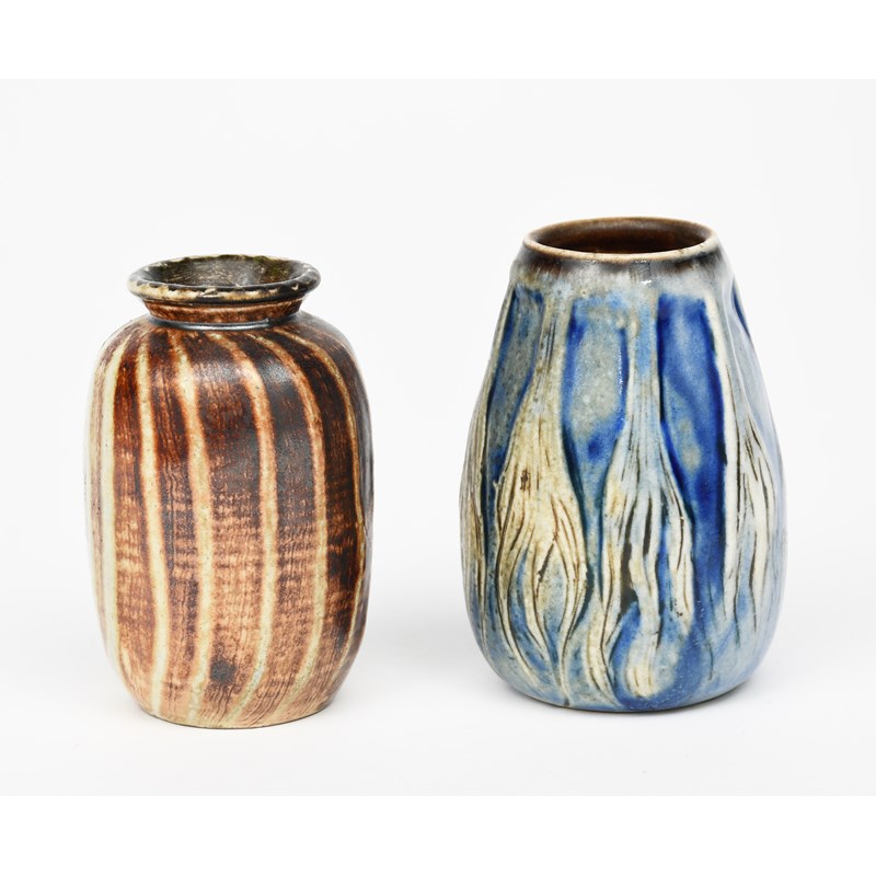 A Martin Brothers stoneware gourd vase by Edwin and Walter Martin, dated 1896, shouldered form, with simple rib decoration, glazed brown over buff, and another Martin Brothers stoneware gourd incised 2-96 Martin Bros London 8.5cm. high (2)