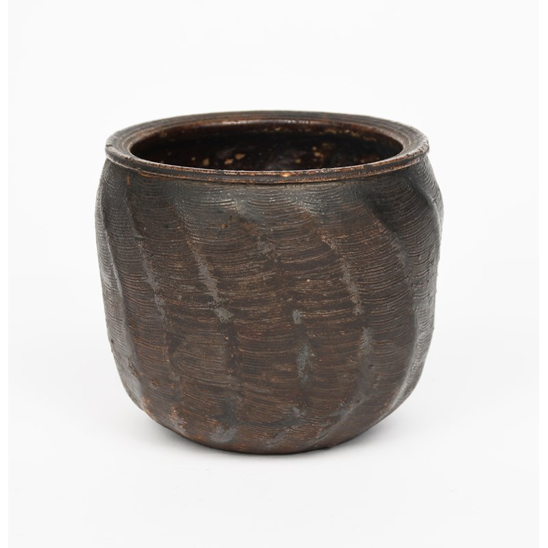 A Martin Brothers stoneware gourd vase by Edwin and Walter Martin, modelled with curved ribs and fine veins, covered in a deep ochre glaze incised 1 -1915 Martin Bros Southall, firing crack to base, 10.5cm. high