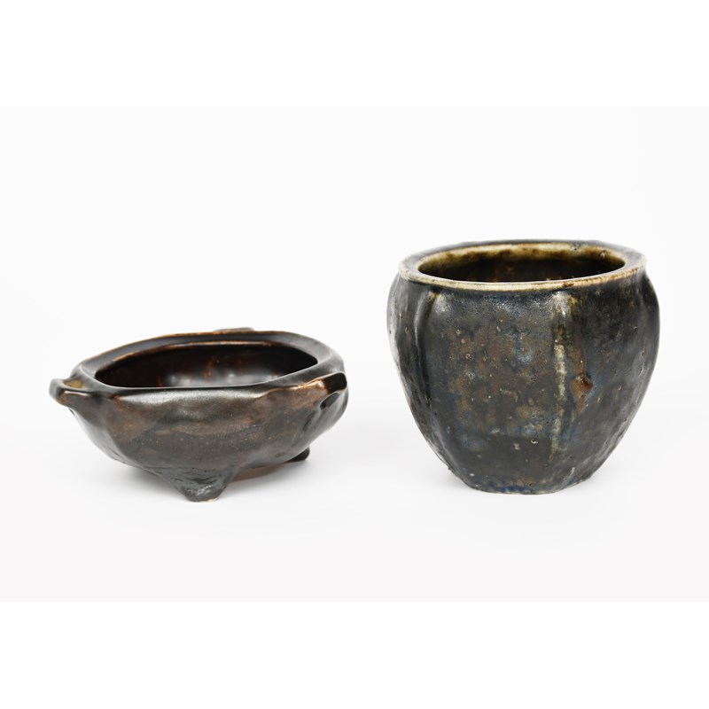 A Martin Brothers stoneware gourd vase by Edwin and Walter Martin, dated 1907, hexagonal section with three handles, covered in a deep chestnut brown glaze, and a Martin Brothers stoneware gourd fern pot, incised 11-1907 Martin Bros London & Southall, 12.5cm. wide, (2)