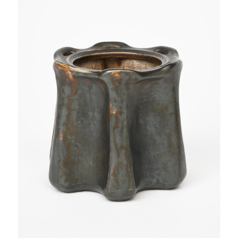 A Martin Brothers stoneware gourd vase by Edwin and Walter Martin, lobed cylindrical form with pierced top rim, covered in a bronze glaze incised Southall Potteries, Martin Bros, 13cm. high