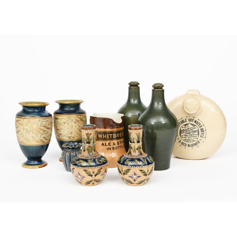 A pair of Fulham Pottery vases, ovoid with cylindrical necks, incised with bands of stylised foliage in green and blue on a buff ground, with white beadwork borders, three Fulham Pottery water bottles, a pair of Royal Doulton Slater's patent vases, another small vase, and a Royal Doulton Whitbreads Ale and Stout advertising water jug, impressed marks incised artist monogram, 14cm. high (9)