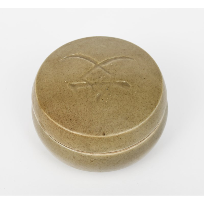 a Leach Pottery stoneware pot and cover, circular form, the cover incised with a simple Japanese character, covered in a celadon glaze impressed Leach Pottery seal mark, annotated in pencil Bernard Leach, 9.5cm. diam. (2)