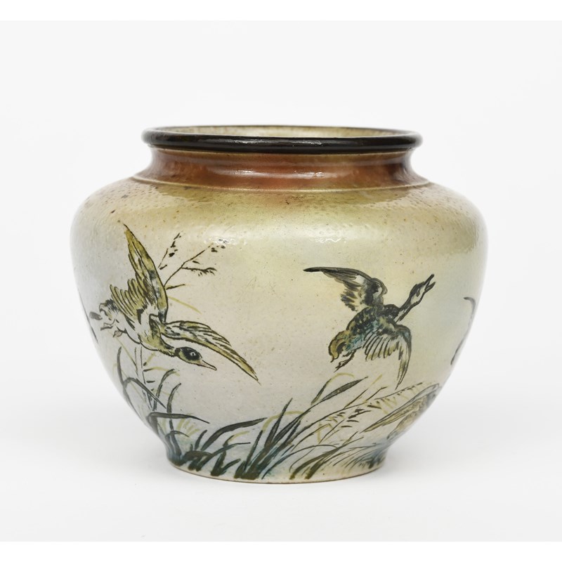 A Martin Brothers stoneware Bird vase by Edwin & Walter Martin, dated 1890, shouldered form, painted with a heron wading amongst bull rushes on a riverbank, a flock of ducks flying above the river, in green and blue on a buff ground, incised 10-1890, Martin Bros London & Southall, museum restored, 9.5cm. high