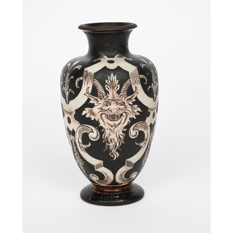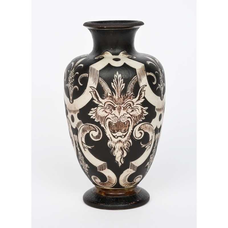 A Martin Brothers stoneware vase by Edwin and Walter Martin, dated 1896, shouldered form, painted with grotesque goat masks inside scrolling trellis, in brown on a buff ground, incised 10-1896 Martin Bros London & Southall, 21cm. high