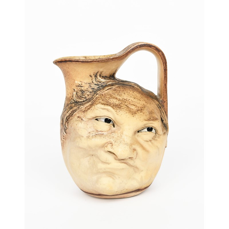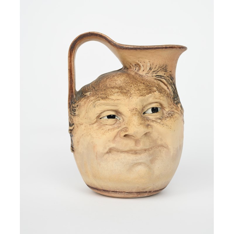 A Martin Brothers stoneware face jug designed by Robert Wallace Martin, dated 1900, cast in relief with a smiling face, the reverse with a smirking face, highlighted in white and black, incised 1-1900 Martin Bros London & Southall, 18cm. high