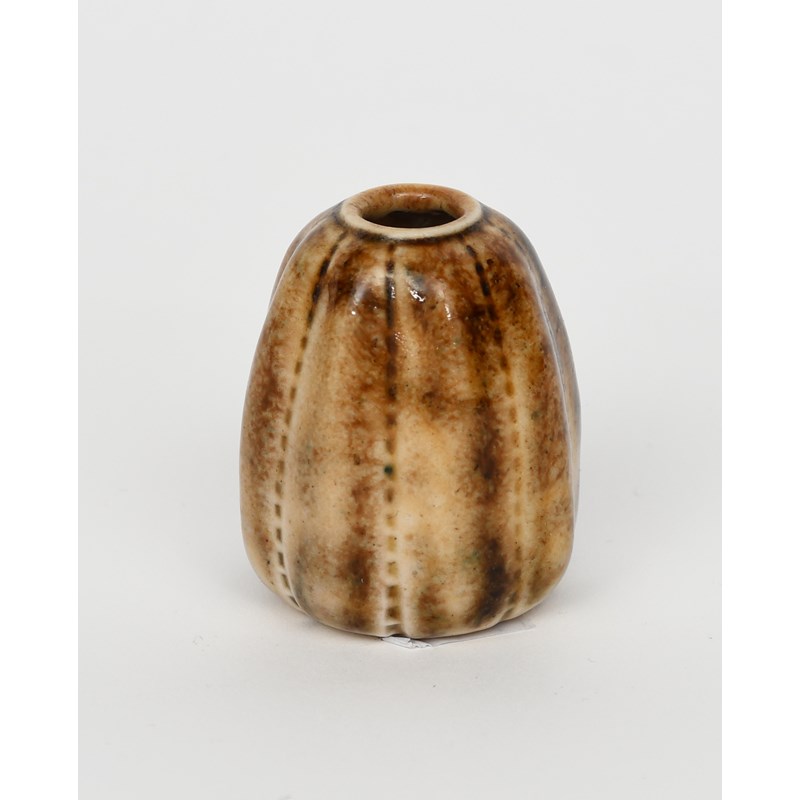 A Martin Brothers stoneware miniature gourd vase by Edwin and Walter Martin, dated 1907, shouldered, ribbed form, covered in a mottled brown glaze, with incised dashes, incised 11-1907 Martin Bros, London & Southall, 4.5cm. high
