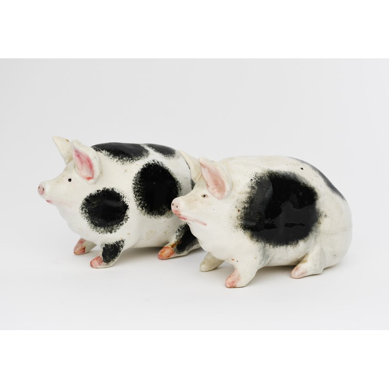 A pair of small Wemyss Pottery pigs, retailed by Thomas Goode & Sons, painted with black spots and pink highlights, impressed, printed and painted marks, restored ears, 15cm. wide, (2)