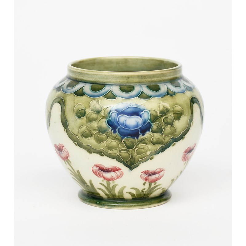 'Floral Panel' a James Macintyre & Co vase designed by William Moorcroft, shouldered, swollen form, tubeline decorated with flower panels in shades of pink, blue and green on a white ground printed factory mark, painted green signature, 8.5cm. high