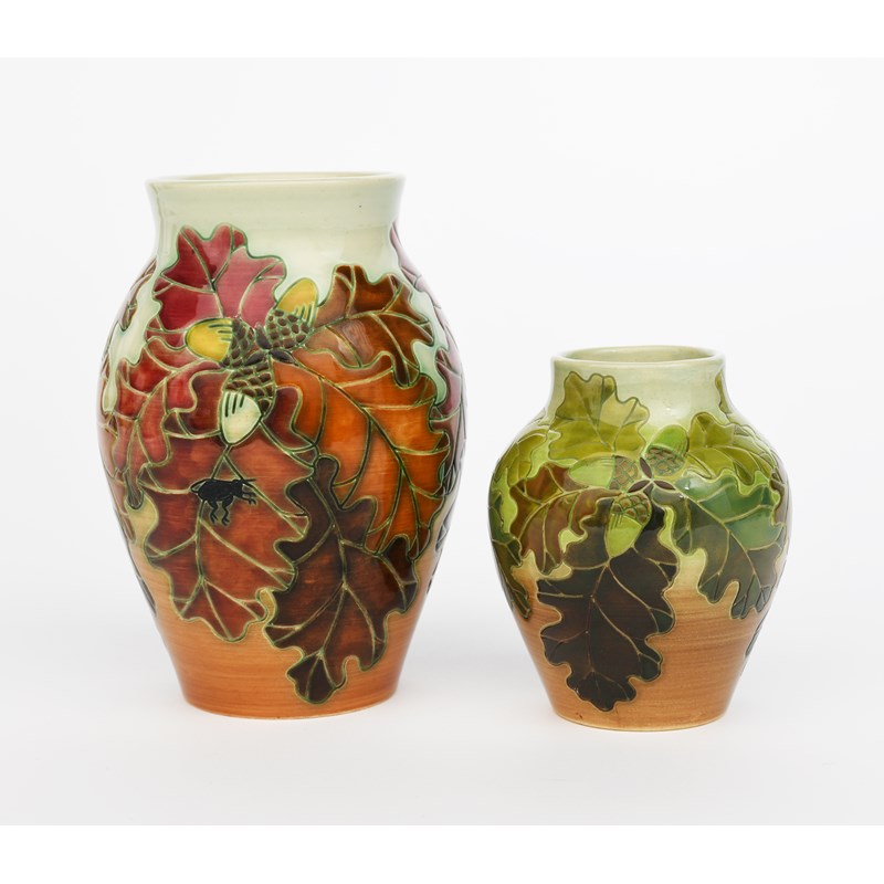 'Oak Leaf and Ladybird' a Dennis Chinaworks vase designed by Sally Tuffin, dated 1997, painted in colours, and an 'Autumn Oak' Dennis Chinaworks vase, impressed and painted marks, 19cm. high (tallest), (2)