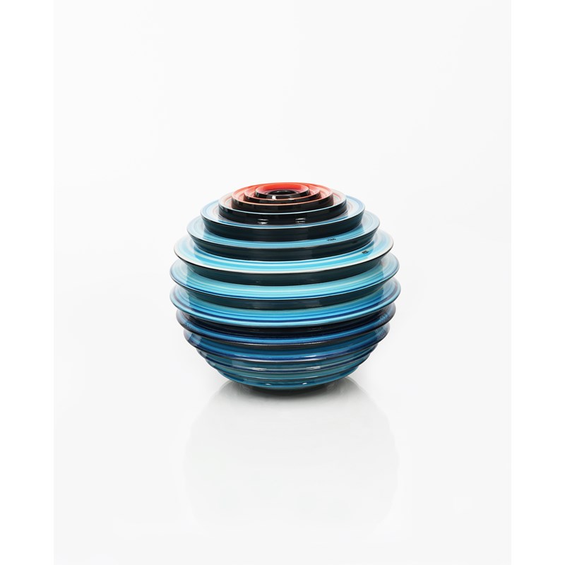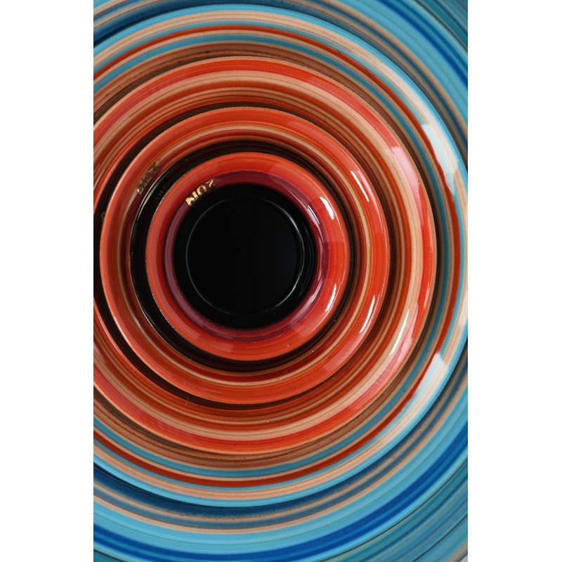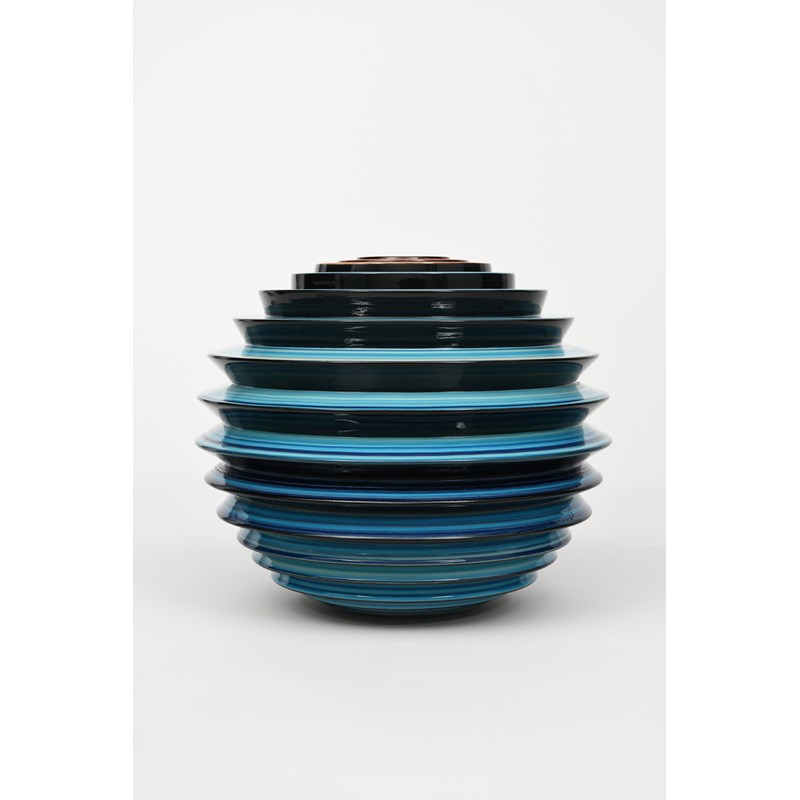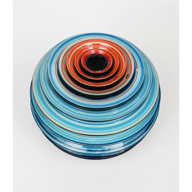'Warming Stripes 1850-2019' a Dennis Chinaworks Petaloid shape vase designed and decorated by Buchan Dennis, dated 2019, thrown and turned by Rory Mcleod, inspired by Professor Ed Hawkins, the coloured bands representing global warming time lines from 1850-2018, impressed and painted marks, WW18, 24cm. high