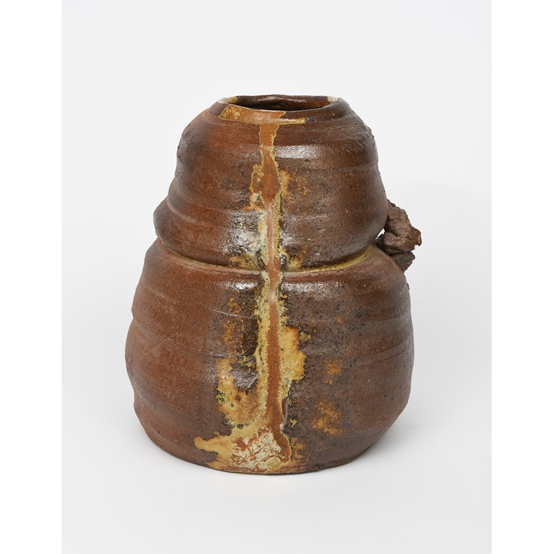 a large stoneware vase, with cut side and applied lug, salt glazed finish with brushed and splashed decoration, impressed seal mark, 34cm. high