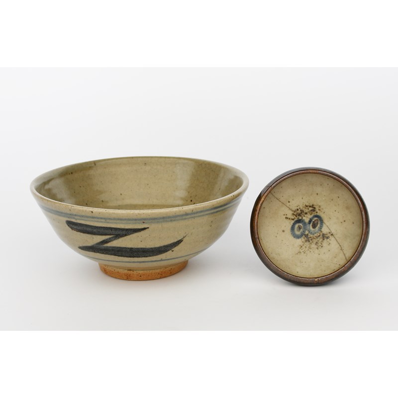 a Leach Pottery shallow bowl, painted to the interior with two flowers in blue and tenmoku on an oatmeal ground, and a larger Leach Pottery bowl painted with Z brush stroke motif, painted BL to small bowl, repaired, 12cm. diam. (2)