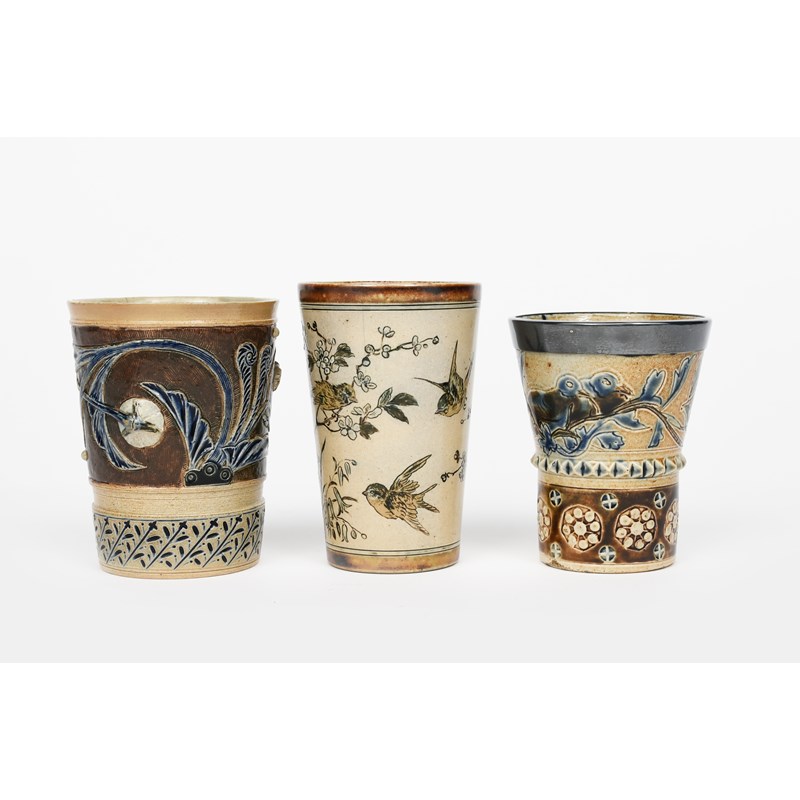 A Martin Brothers stoneware beaker by Edwin and Walter Martin, dated 1890, conical form, incised and painted with finches flying and perched amongst wildflower stems, in green. blue and white on a buff ground, between brown bands, another early Martin Brothers stoneware beaker by Robert Wallace Martin dated 1874, and a C.J.C Bailey Fulham Pottery beaker with white metal rim, main beaker incised 10-1890 Martin Bros London & Southall, applied paper collection label to base and paper priced label, hairlines, 12cm. high, (3)
