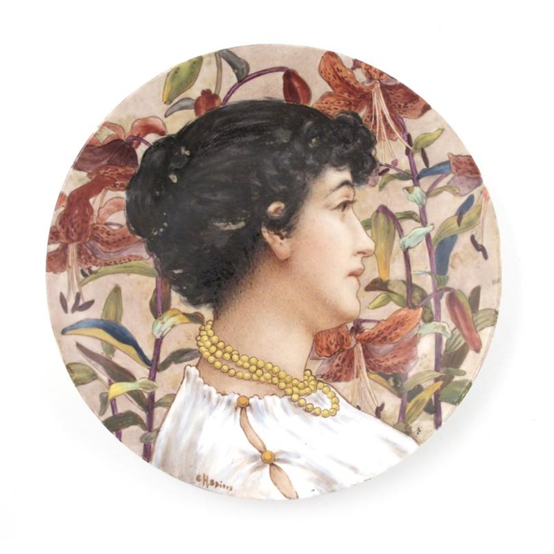 A Minton's Aesthetic Movement plate painted by Charlotte Spiers, painted with a maiden portrait before red lilies impressed marks, painted signature 24.5cm. diam.