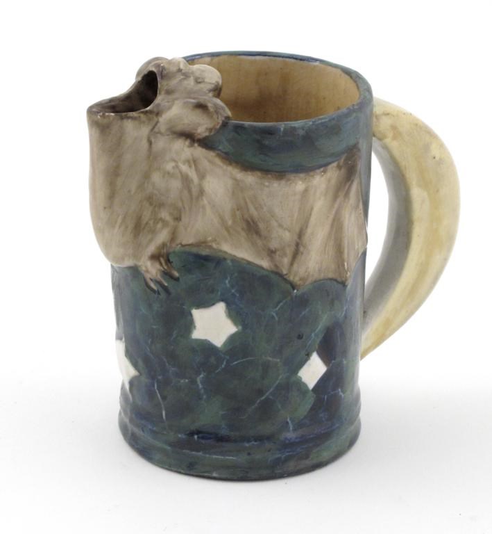 A rare pottery bat jug designed by Blanche Vulliamy, the spout modelled as a flying bat, the handle a crescent moon, with raised star motif, glazed in colours unsigned 14cm. high