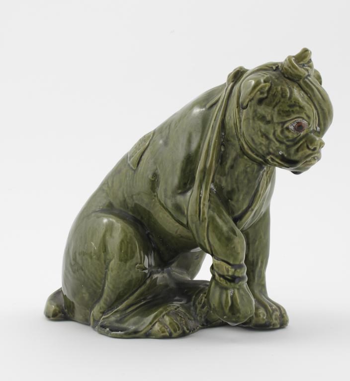 A Bretby Pottery model of a wounded dog, modelled seated with paw raised in a sling and one eye bandaged - a note to his back 'After the Battle', glazed green, applied glass eye impressed marks, 21cm. high