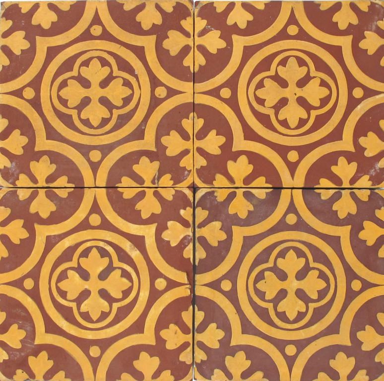Four early Minton tiles, the design attributed to A W N Pugin, slip painted with foliate roundels and ogee panels in yellow on terracotta impressed marks, 15cm. square