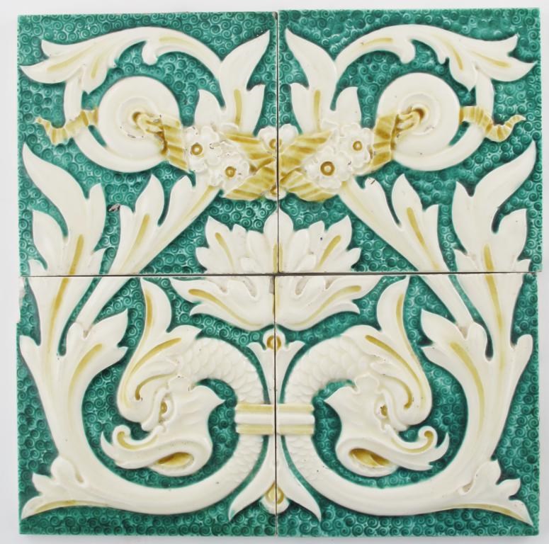 Four Minton's press moulded tiles, designed for J Sainsbury's, decorated in low relief with flower swags before scrolling foliage in ochre and cream on a green ground impressed marks, minor frits 15cm. square