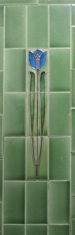 Two Art Nouveau tile panels, painted with a tulip stem in blue and green on a green ground, damages 97 x 27cm.