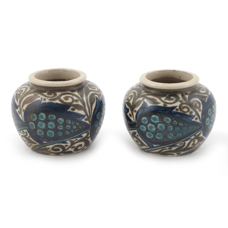 A pair of John Pearson pottery vases, shouldered form with everted top rims, each painted with a frieze of flowers on scrolling foliage, in shades of blue and green on a cream ground painted JP X mark, 8.5cm. high