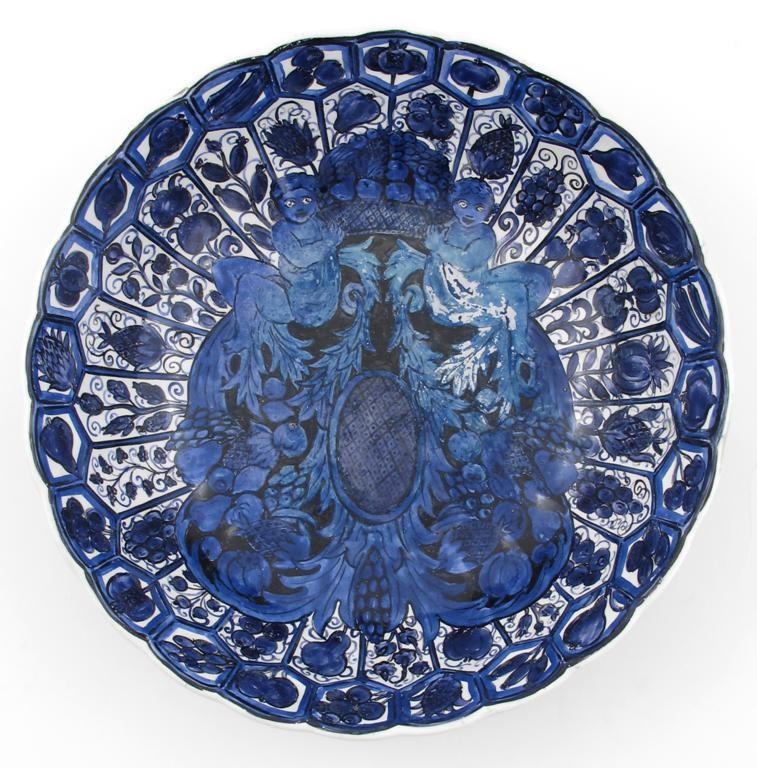 A large John Pearson fluted bowl, painted to the well with classical figures amongst swags, fruit and foliage in blue on a white ground painted JP monogram, museum restored rim, 33cm. diam.