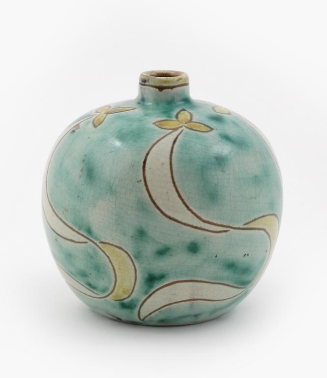 A Della Robbia pottery miniature vase by Cassandia Ann Walker, ovoid, incised and painted with flower stems in yellow, white and turquoise incised marks to base 7.5cm. high