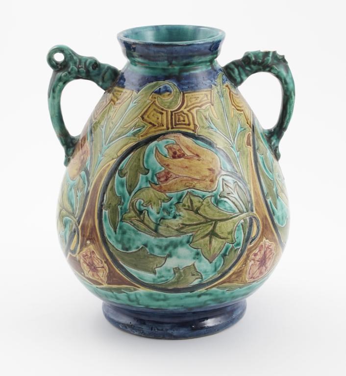 A large Della Robbia Pottery twin-handled vase by Charles Collis, incised and painted with panels of tulip flowers in shades of green, blue, red and ochre, incised and painted marks, repairs and chips to handles 32cm. high