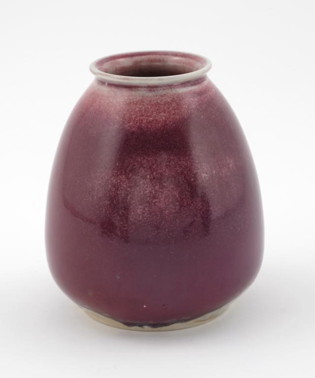 A Ruskin Pottery high-fired stoneware vase, dated 1933, shouldered form, covered in a pale red glaze running to the foot, over white impressed marks, 14cm. high