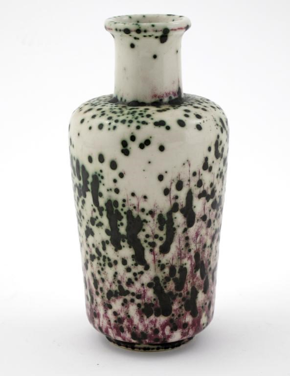A Ruskin Pottery high-fired stoneware vase, dated 1906, shouldered form, covered in a white glaze over sang de boeuf speckled with mint green impressed marks, 19cm. high