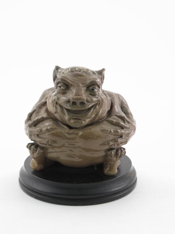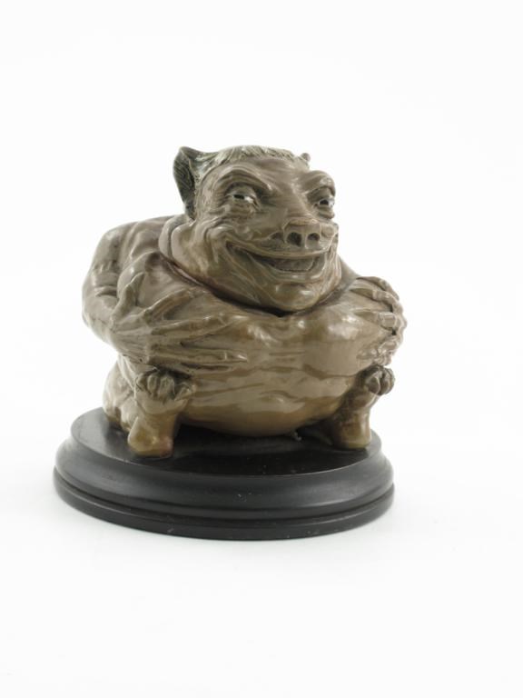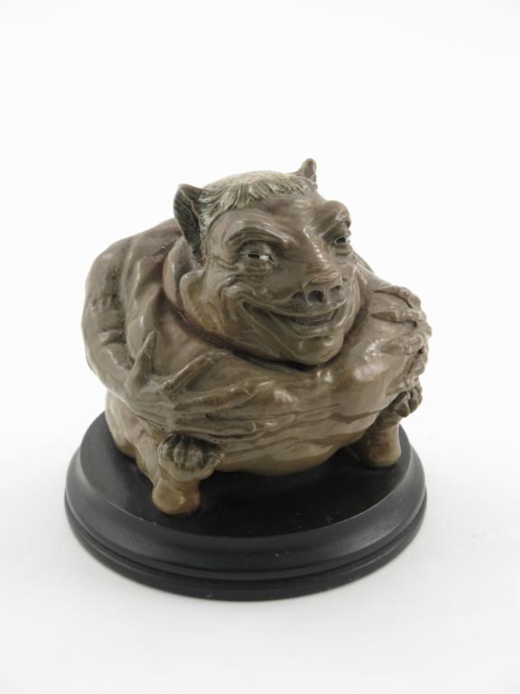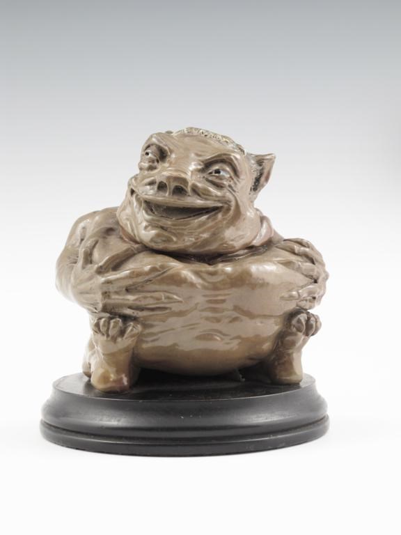 A rare Martin Brothers stoneware grotesque jar and cover dated October 1900, the seated creature grasping its chest with long bony fingers with pointed nails, casting a slight sideways glance and smile, with shaved monk's pate, on ebonised wood base incised marks R W Martin & Bros, London & Southall 10 1900 to head, the base Martin Bros 10 1900, 16.5cm. high Literature Malcolm Haslam The Martin Brothers Potters Richard Dennis Publications, page 150 figure 240.
