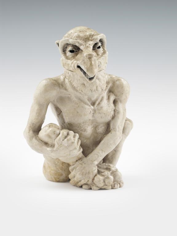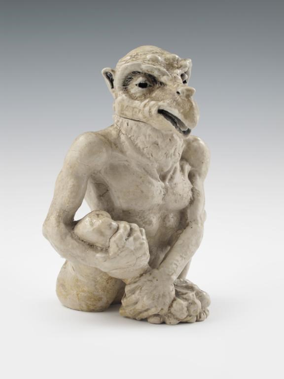 A rare Martin Brothers stoneware bird-man jar and cover, by Robert Wallace Martin, dated 1907, modelled seated with legs raised up to chest and arms holding one leg, with anthropomorphic bird head with hooked open beak, glazed ochre impressed roundel mark, incised R W Martin Southall, 4 1907 to head and base 21cm. high Literature Malcolm Haslam, The Martin Brothers Potters, Richard Dennis Publications, page 129 figure 197 for another example The Harriman Judd Collection part II, Sotheby's New York, 6th October 2001, page 42 lot 139 for a comparable example. Provenance The Martin Brothers David Rago, New York City 1995, page 28 catalogue number 97. private collection