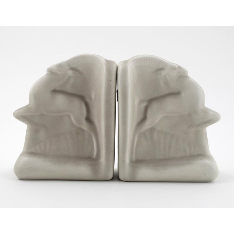 A pair of Pilkington's Royal Lancastrian book ends, each modelled as a leaping Ibex, glazed matt white-grey impressed marks, 16.5cm. high