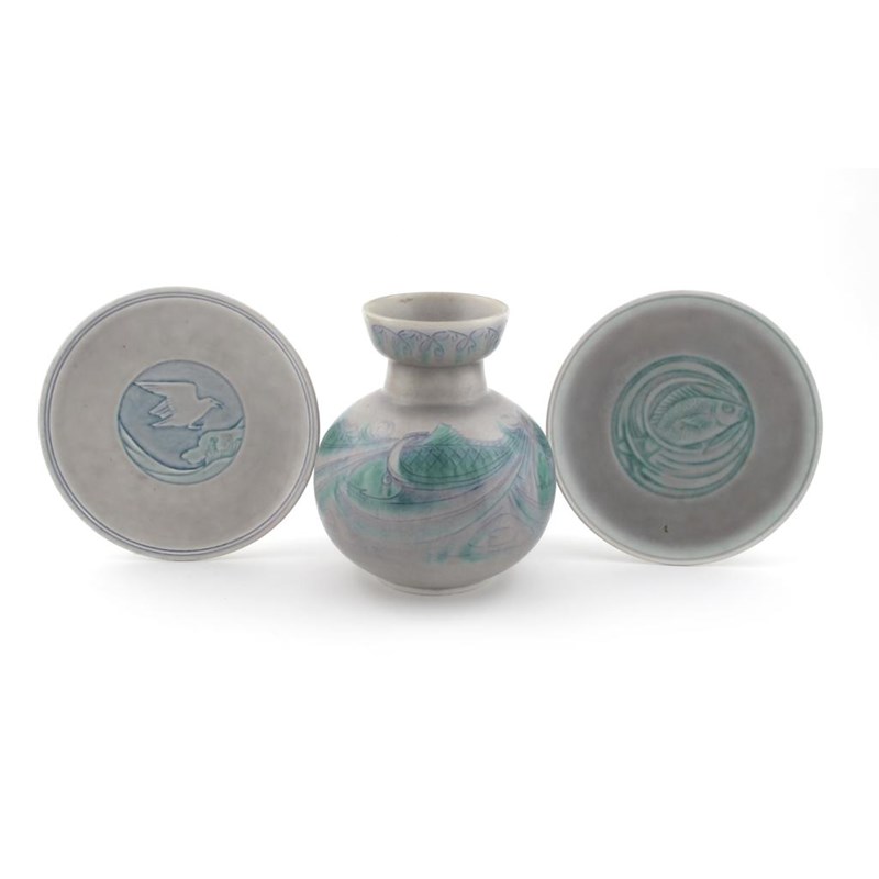 A Pilkington's Royal Lancastrian plate by William S Mycock, dated 1934, modelled in low relief with a fish swimming in swirling water in blue on a silver-grey ground, another decorated with a seagull roundel and a vase painted with a frieze of fish impressed and incised marks, 20.5cm. diam.