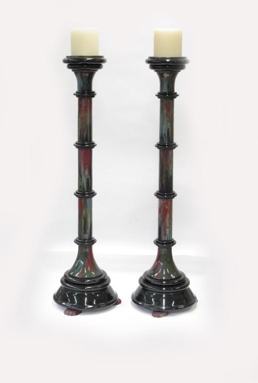 A pair of monumental Sunflower Pottery candlesticks by Sir Edmund Elton, comprising tapering, stepped base on three claw feet, with cylindrical section stem and flaring sconce with brass tray, glazed blue and marbled red, green and ochre 135cm. high