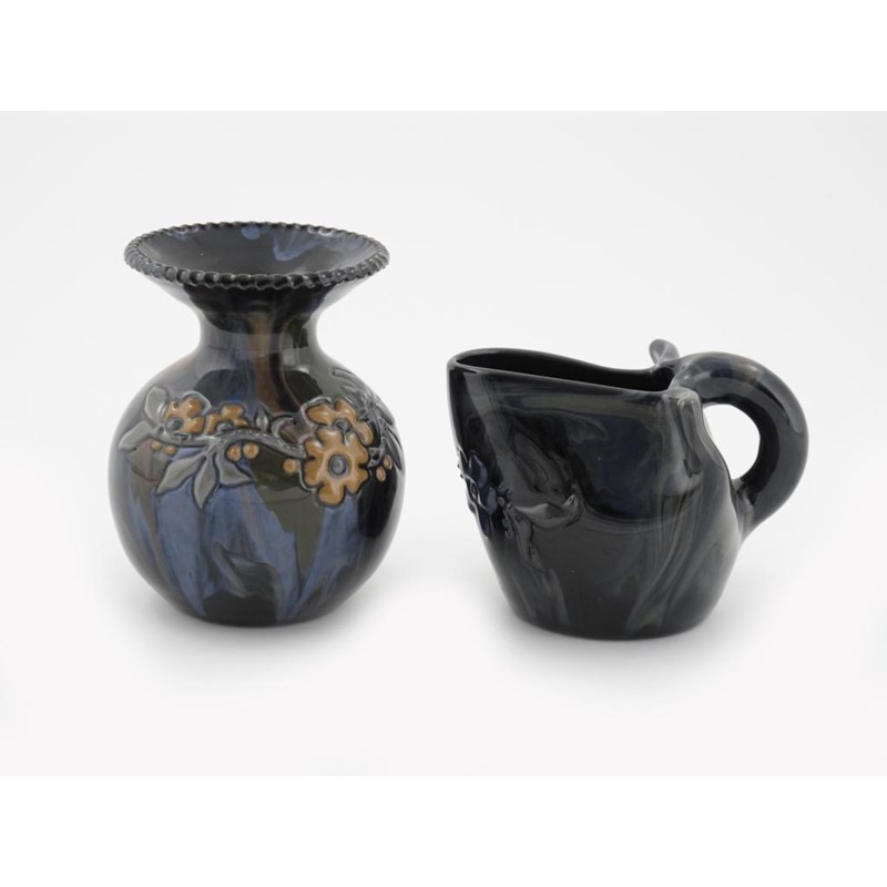 A Sunflower Pottery vase by Sir Edmund Elton, slip decorated with flowers and foliage in ochre and green on a green and blue streaked ground and a jug with a pinched rim painted Elton mark, vase 11cm. high
