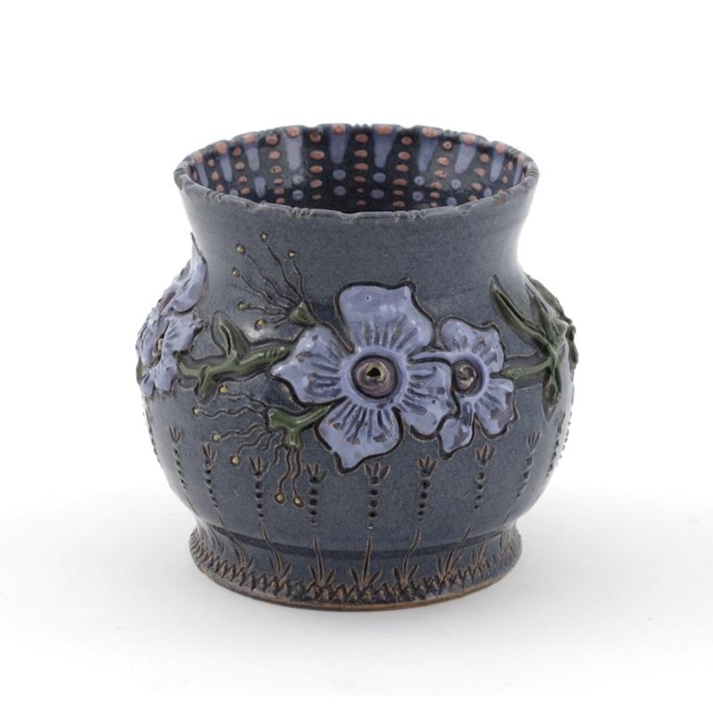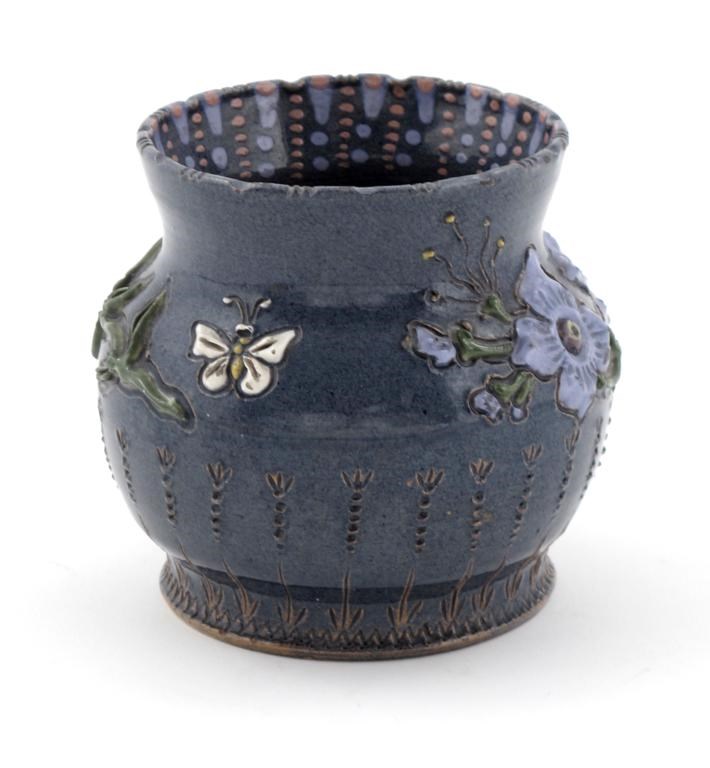 An early Sunflower Pottery vase by Sir Edmund Elton, dated 1881, modelled in low relief and slip decorated with flowers and incised foliage, in shades of green and blue on a blue ground, slip decorated with pink and blue dots to the inside of the neck painted Elton mark, dated 1881, 12.5cm. high