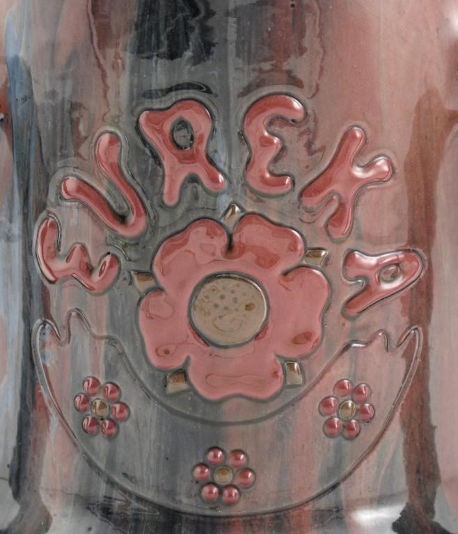 A rare Sunflower Pottery commemorative Tyg by Sir Edmund Elton, slip decorated with tulip flower panels, one inscribed 'Eureka' in coral red and ochre on a streaked blue, ochre and green ground painted Elton to base, professionally restored 19.5cm. high
