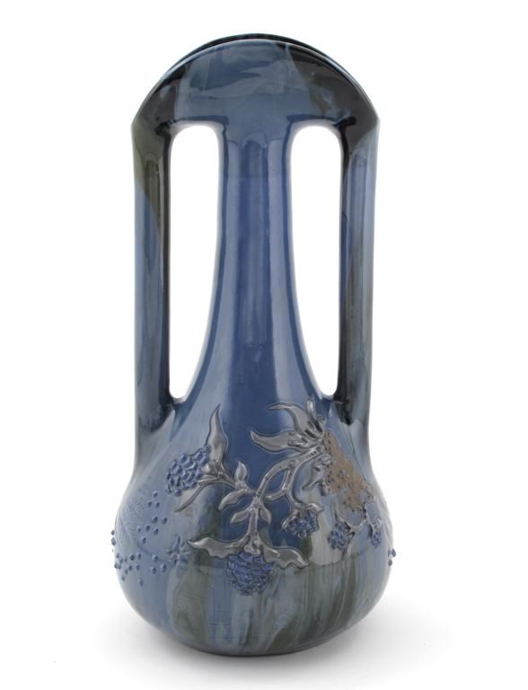 A Sunflower Pottery tall twin-handled vase by Sir Edmund Elton, slip decorated with flowering coral sprays and air bubbles and a butterfly, in shades of green, blue and ochre on a streaked green and blue ground painted Elton mark to base 39cm. high