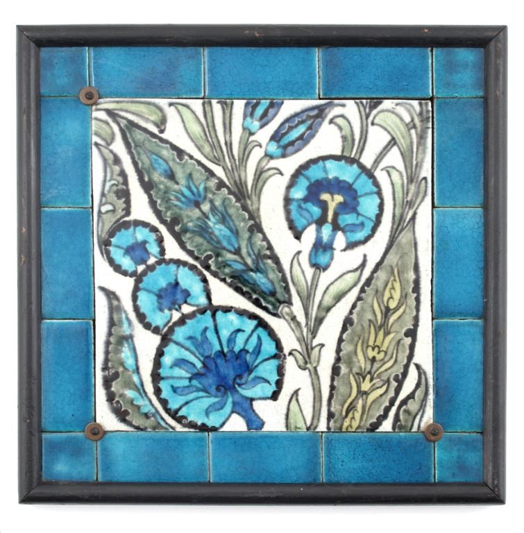 A William De Morgan Iznik tile panel, the large central tile with stylised flowers in shades of blue, green and black, inside a blue tile border, framed, central tile 23cm. square