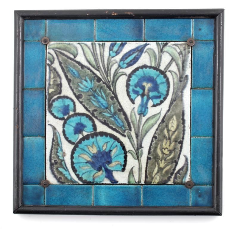 A William De Morgan Iznik tile panel, the large central tile with stylised flowers in shades of blue, green and black, inside a blue tile border, framed, central tile 23cm. square