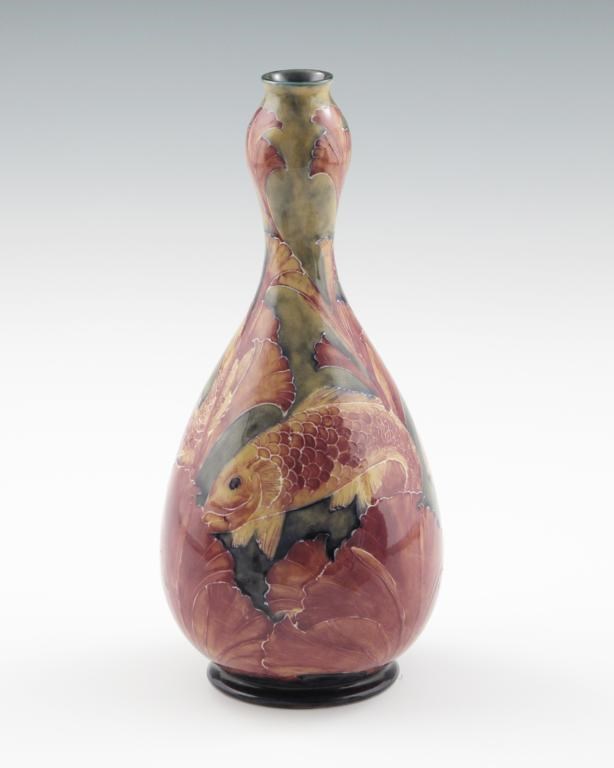'Flambe Carp' a Unique James Macintyre & Co vase by William Moorcroft, ovoid with knopped neck, tubeline decorated with three Carp fish swimming amongst waterweed, in shades of blue and green, highlighted in flambe impressed Burslem mark, painted green signature 30.5cm. high Provenance Ken Manley collection