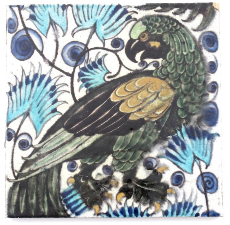 A large William De Morgan Sands End Pottery Parrot tile, painted in shades of green, blue and yellow on a white ground impressed mark 20.5cm. square