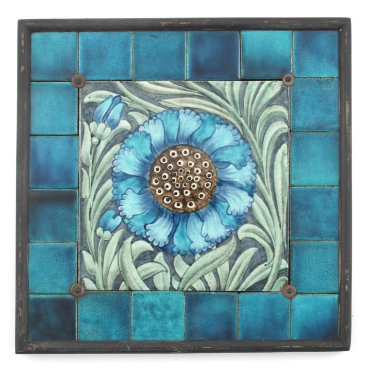 A William De Morgan Marlborough tile panel, the large central tile painted in shades of green, blue, ochre and yellow, inside a border of blue tiles, framed central tile 20.5cm.
